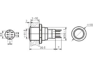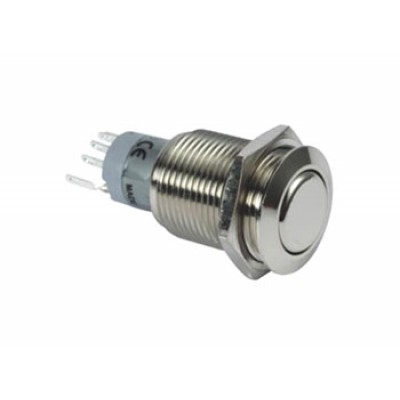 Deviatore a pulsante antivandalo in metallo con funzione ON/OFF. Contatti: 1N.aperto e 1 N.chiuso, temperatura di funzionamento: da -25°C a +55°C, umidità: 45 ~ 85% RH, resistenza di isolamento: > 100 Mohm, resistenza di contatto: < 50 Mohm, contatto materiale: lega d'argento, vita meccanica: 1.000.000 cicli (ON/OFF), vita elettrica: 50.000 cicli, rigidità dielettrica: tra i terminali dello stesso polo: 1000 Vac - tra i terminali di diversi poli: 2000 Vac, corpo materiale: ottone nichelato, massima tensione contatti: 24 Vdc / 1 A - 230 Vac / 0,5 A, foro di fissaggio: Ø 16 mm.