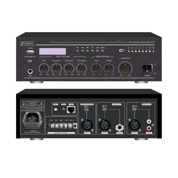 Amplificatore PA da tavolo con potenza di uscita di 60W. Provvisto di 3 ingressi MIC (di cui 2 AUX selezionabili) e una presa LAN per la connessione a internet. L'ingresso MIC 1 è provvisto di presa XLR 3P/6,3 mm con possibilità di alimentazione Phantom +48V. Funzione voice priority per l'assegnazione di priorità all'ingresso MIC 1. Controllo individuale del livello per gli ingressi MIC e AUX. L'amplificatore è provvisto di controllo toni alti e bassi separati + volume master. È presente anche un VU-Meter a 5 led per indicare il livello di uscita. Possono essere collegati sia diffusori a bassa impedenza (4~16O) che a tensione costante (70V/100V). Connessione a un router/access point tramite Wi-Fi (o rete LAN cablata in caso di segnale problematico) per lo streaming musicale. Funzione Bluetooth per la connessione diretta di Smartphone utilizzati come riproduttori musicali. Lettore USB per memoria di massa esterna (pendrive, HDD, etc.). Questi amplificatori sono provvisti di protezione contro cortocircuiti e sovratemperatura.