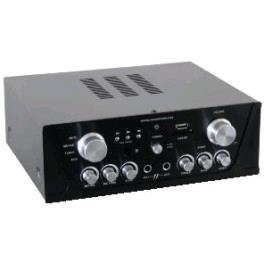Mini amplificatore Karaoke per uso domestico. 2 ingressi microfonici frontali. Controlli toni e volume. Tuner FM incorporato. Effetto Echo incorporato e regolabile. Ingresso per DVD, CD e lettori a cassette. 4 ingressi Line stereo RCA. Dimensioni e peso contenuti. Porta USB e slot SD MP3 compatibili. Telecomando incluso. Potenza 2x 50W a 8Ohm. Dimensioni 95 x 250 x 240mm, peso 2,5Kg.