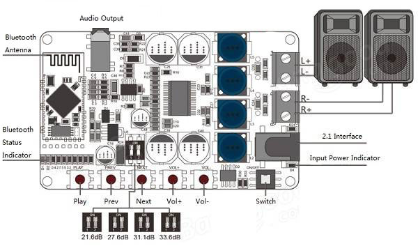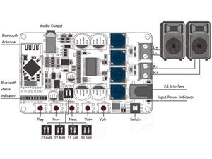 Basato sull'integrato TDA7492P, dispone di 5 pulsanti di controllo direttamente sulla scheda, dip switch per l’impostazione del guadagno e presa jack per uscita audio.