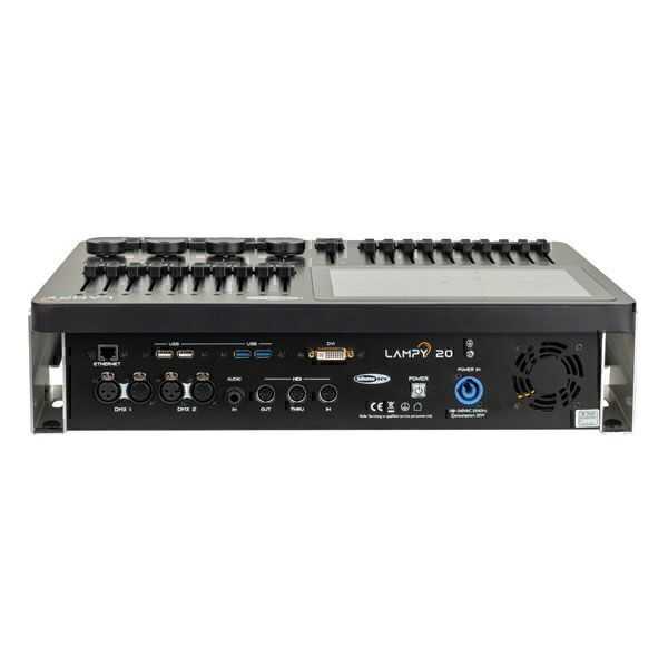 Console DMX completa con un nuovo concetto di design moderno ed intuitivo per controllare proiettori mobili e statici in tanti contesti di applicazione. Il design lineare e chiaro, con lo schermo touch da 10,1" e gli indicatori LED multicolore, rendono il flusso di lavoro rapido ed intuitivo. Posizionare i vari elementi è particolarmente semplice con gli spazi di lavoro personalizzabili e la Fixture View con cui avere un layout virtuale dello stage con possibilità di selezionare a trascinare gli elementi. Anche la selezione dei colori ed il controllo di ogni proiettore mobile può essere fatto con precisione ed immediatamente. La Lampy 20 1U consente l'uscita su uno schermo touch esterno oltre che il pieno controllo remoto dello show da tablet grazie alla compatibilità con OSC. Possibile creare show di grande impatto con il generatore di effetti integrato. La Lampy 20 1U è dotata inoltre di 4 ruote encoder ciascuna con display OLED 1,3" per mostrare rapidamente le informazioni di stato.