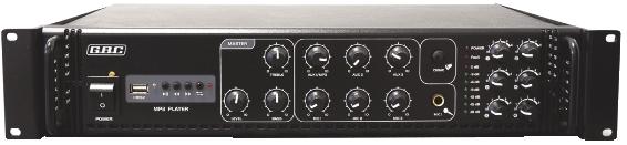 Amplificatore integrato di potenza adatto per le applicazioni Public Address più diversificate e impegnative. Terminali a vite per output 6 zone con controlli separati. Lettore MP3. Raffreddamento a ventola. 3 ingressi Mic e 3 ingressi Aux. 1 output Line. Uscita PA a 70V / 100V. Uscita 4-16 Ohm per la connessione di un sistema di altoparlanti passivo per il monitor, potenza di output massima inferiore a un terzo della potenza nominale. Connessione Mic sul pannello frontale con funzione di priorità.