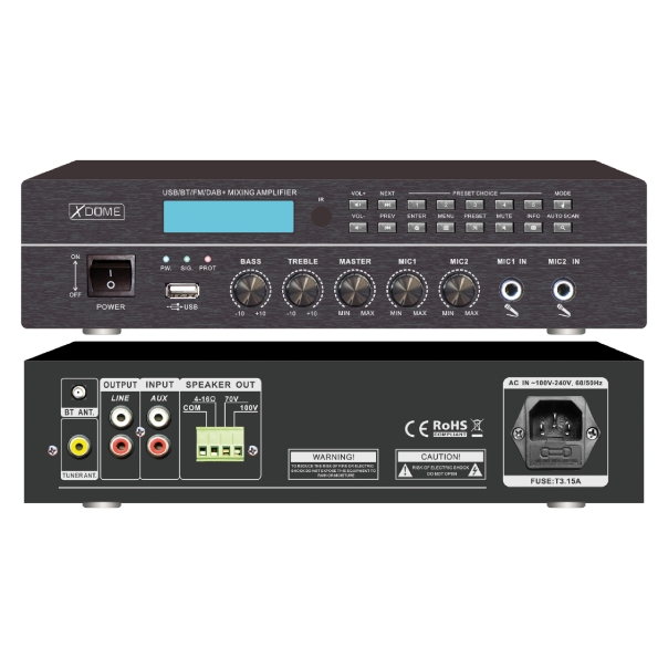 Possono essere collegati sia diffusori a bassa impedenza (4~16O) che a tensione costante (70V/100V). Funzione Bluetooth per la connessione diretta di Smartphone utilizzati come riproduttori musicali. Lettore USB MP3 per memoria di massa esterna (pendrive, HDD, etc.). Ricevitore DAB+ per la ricezione di stazioni digitali e ricevitore FM. Questi amplificatori sono provvisti di protezione contro cortocircuiti e sovratemperatura.