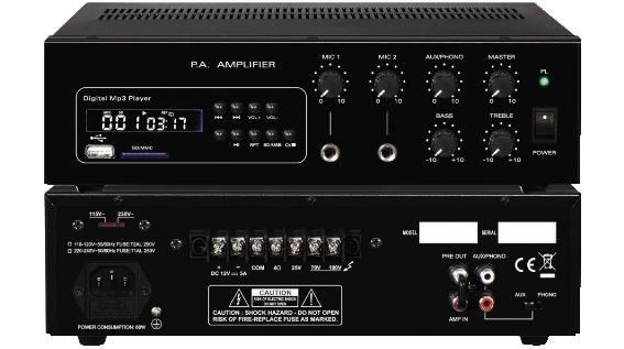 Amplificatore di potenza da 30W, lettore MP3 integrato, 2 ingressi microfonici con volumi separati, 1 ingresso aux/phono, bass & treble separati, volume master. Uscita altoparlanti 2-16O. Doppia alimentazione (115/230Vca - 12Vcc).
