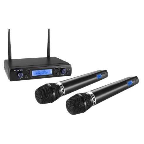 Sistema microfonico senza fili UHF 16 canali a doppia frequenza con 2 microfoni palmari. Opera nella banda 863-865MHz ed è consigliato per vocalist e conferenze in pubblico. 2 uscite bilanciate XLR e 1 uscita sbilanciata 6,3mm. Alimentatore e cavetto jack 6,3mm M/M in dotazione.