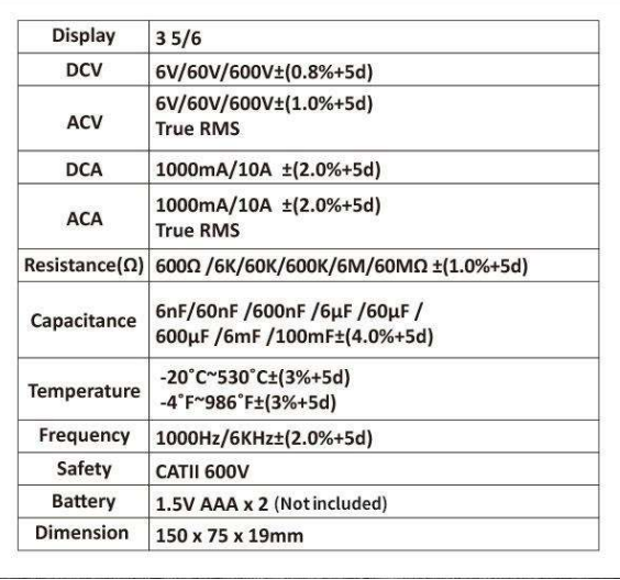 6nF/60nF/600nF/6µF/60µF / 600µF/6mF/100mF±(4.0%+5d)
