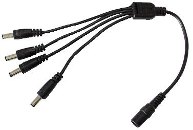 Consente di poter alimentare fino a 4 apparecchiature con un unico alimentatore in corrente continua. Cavo da 30cm con una spina maschio (5,5x2,1mm) e 4 prese femmina (5,5x2,1mm). Indicato per impianti di videosorveglianza o sistemi on-board per telecamere sportive.
