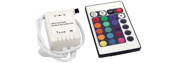 Controller per striscia led RGB in grado di pilotare fino ad un massimo di 6A (2A per canale). Dotato di varie funzioni pre-impostate per soddisfare qualsiasi esigenza, selezionabili tramite comodo telecomando a infrarossi 24 tasti.