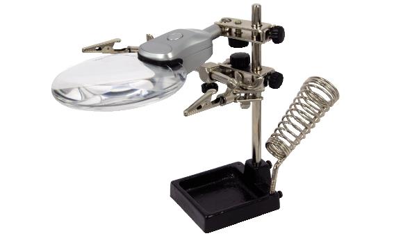 Completo di lente d'ingrandimento con illuminazione led, piedistallo, portasaldatore e di due bracci regolabili in acciaio nichelato, con pinze a coccodrillo. Adatto ad hobbisti e per laboratori, consente la scelta della posizione di lavoro ottimale per la saldatura e l'analisi dei circuiti stampati.